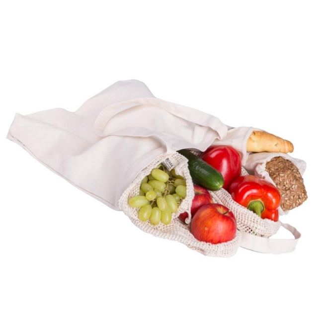 Sada obsahuje: nákupní tašku, dva síťové sáčky, malý síťový sáček, malý plátěný sáček, větší plátěný sáček.